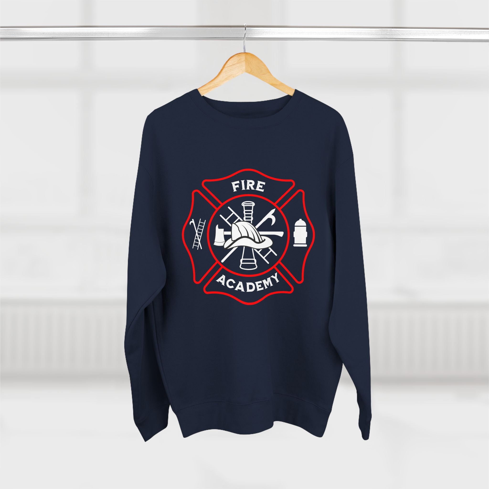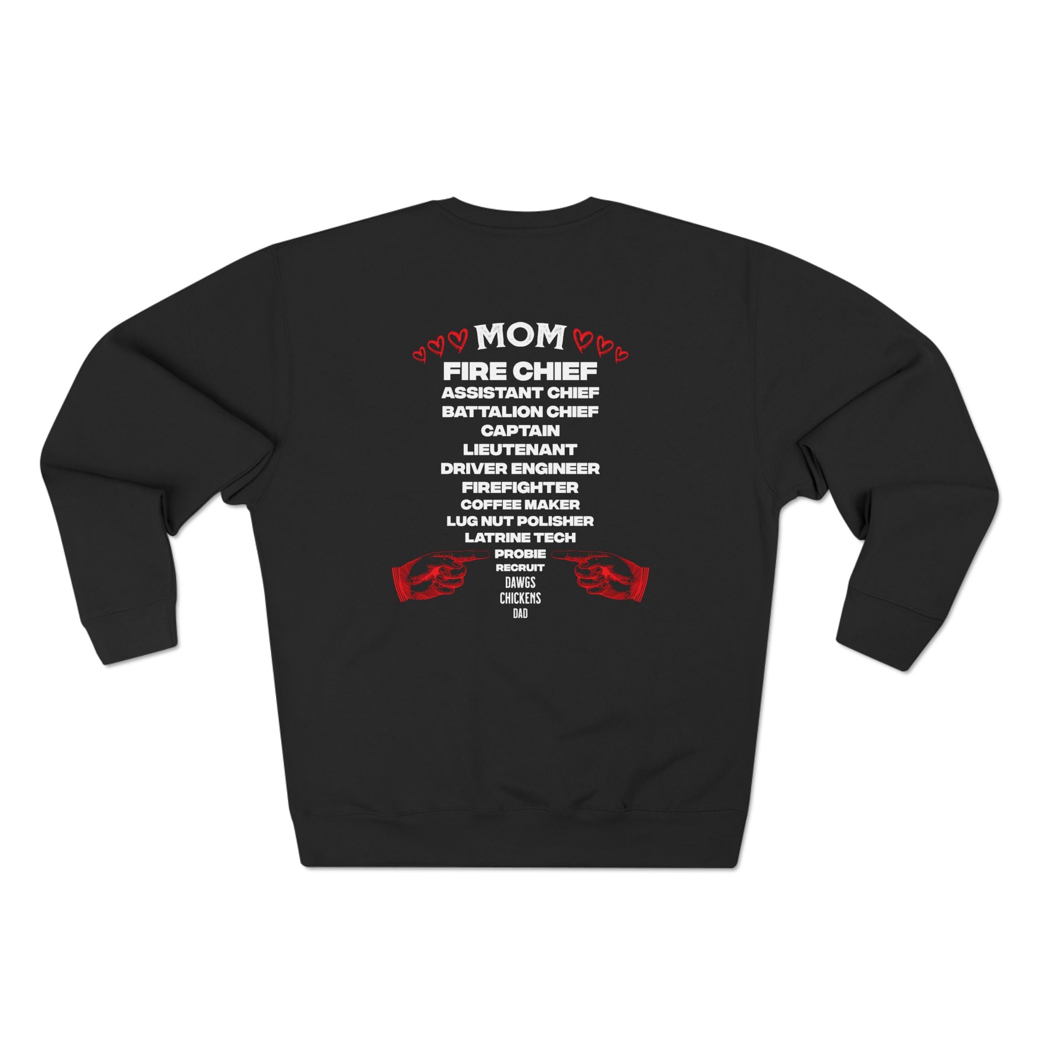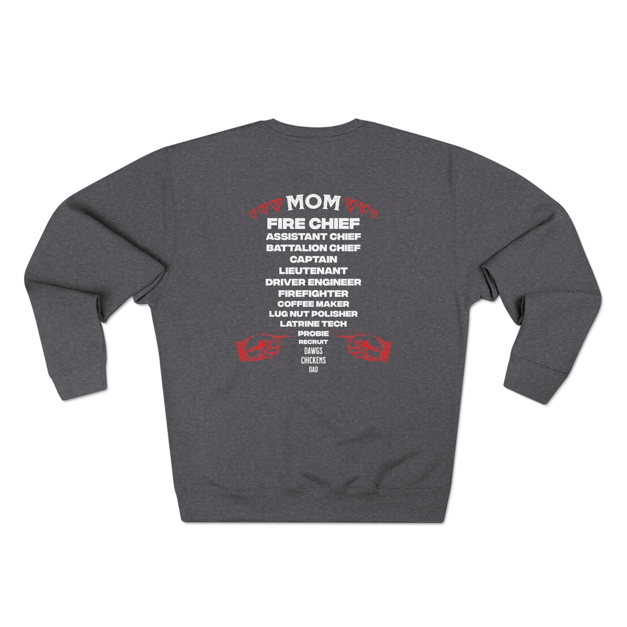 This crewneck sweatshirt carries the quiet pride of someone who’s part of the fire service family. The front shows a classic fire academy emblem—axes, ladder, and helmet—outlined in bold red that reads “Fire Academy.” On the back, a stacked list of firefighter roles leads with “MOM,” a nod to "the big boss" regardless of your rank. The charcoal fleece absorbs the design with a worn-in, honest look. It feels substantial but not stiff, warm on cool mornings at the station or during late-night calls. Wear it between shifts, at trainings, or at informal gatherings with the crew; it reads like a conversation starter, a badge of shared experience and steady commitment.